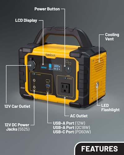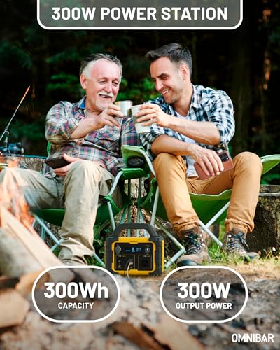 Specification: Omnibar Portable Power Station 300W for Camping, Home Backup and Outdoor Use, 299Wh 6-Port PowerHouse with AC Outlet, 60W USB-C PD Output, USB-A Ports, Car Outlet, 12V DC Ports and LED Flashlight