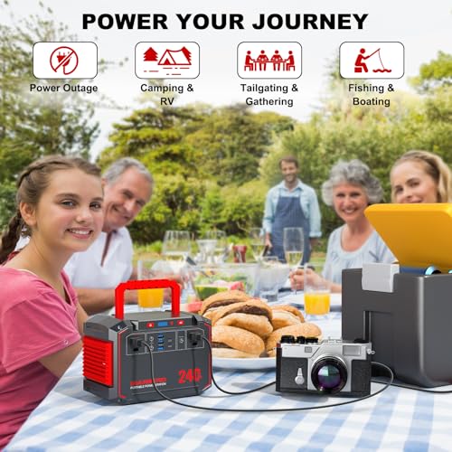 LARGE CAPACITY: With a massive 240Wh capacity(16.2Ah/14.8V) and a built-in durable lithium-ion battery, this portable power station is compatible with 95% of devices on the market, powering essentials like smartphones, tablets, and laptops for longer periods. It can charge your phone 12-15 times, your camera 18-23 times, and your tablet 5-8 times, while running a mini car fridge for 120-190 minutes, a projector for 50-90 minutes, or a standing fan for 120-170 minutes. Whether you’re camping, road tripping, traveling, hunting, fishing, or preparing for emergencies, this power supply has you covered.